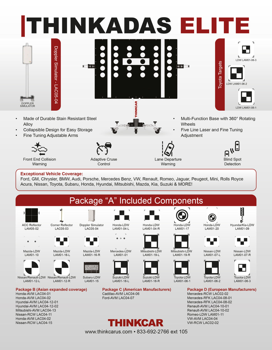 THINKADAS ELITE ADAS is a Fully foldable design including a completely flat folded base, close-fitting foldable arms, and foldable crank handle with a Multi-functional base that integrates 360°rotating wheels, wheel locks, and fine-tuning height-adjustment to adapt to uneven ground. The equilateral triangle design of the base ensures a stable frame Digital distance laser shows the cross-bar height and ensures it is precisely equal to the standard value. Five line laser and fine-tuning switch help to easily center the device and floor to the vehicle and offer high-precision calibrating.