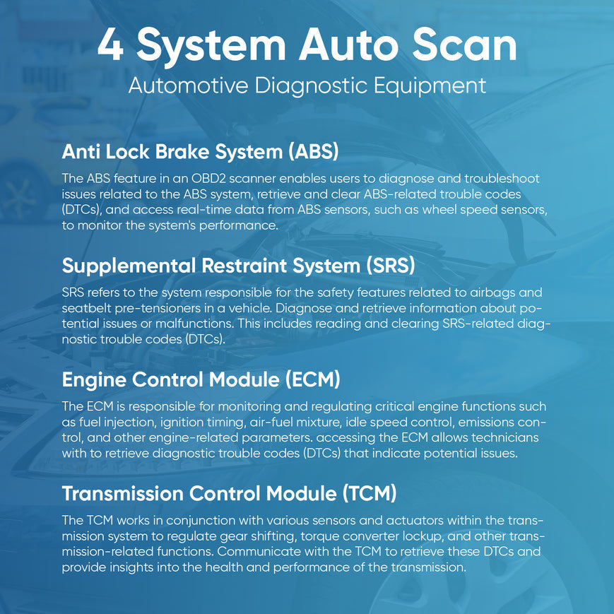 • 3 system support: Choose from engine, transmission, SRS, ABS