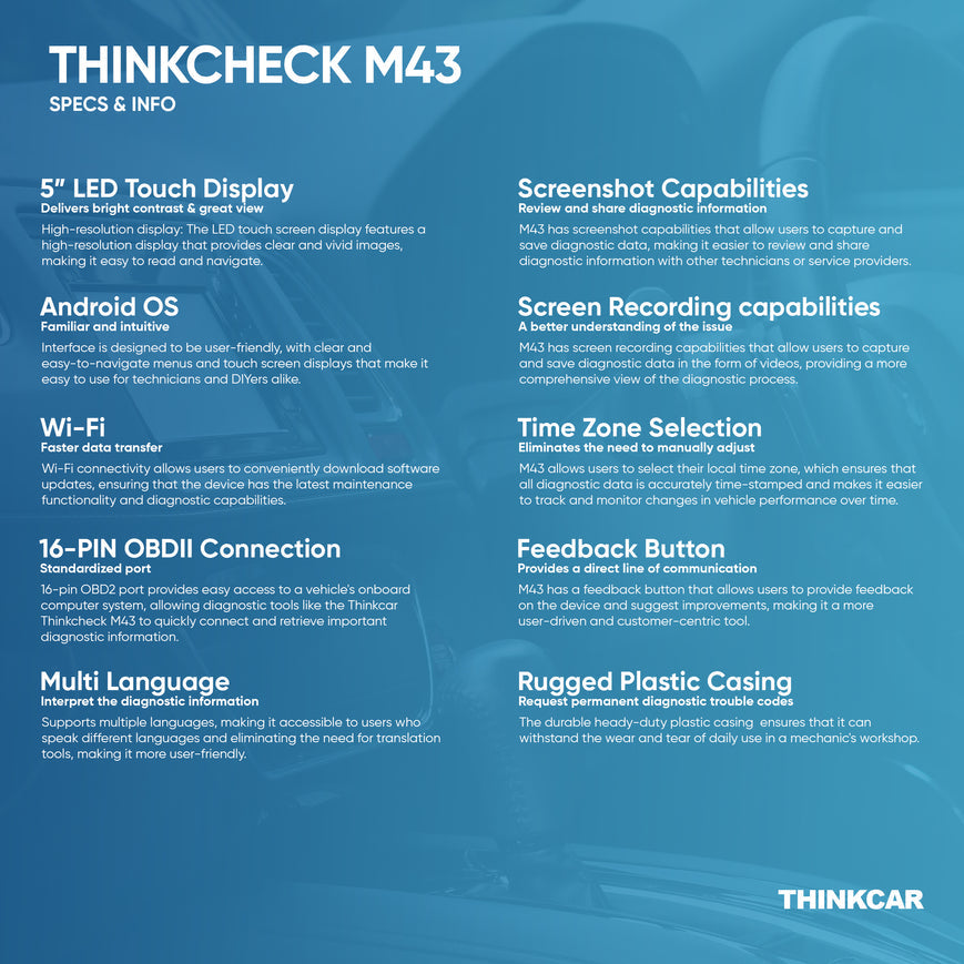 THINKCHECK M43 easiest to use diagnostic tool. The Android-based navigation menu with a color touch screen makes finding the correct element fast and easy. The 4 systems' functionality ensures the tool can access the system you need.